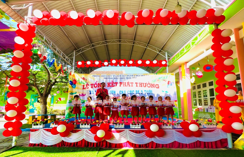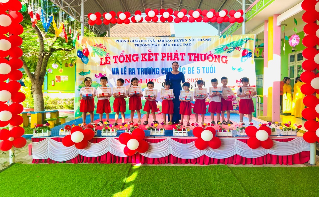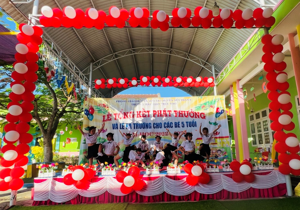 Thực hiện kế hoạch, nhiệm vụ năm học 2022-2023, những ngày cuối tháng 5/2023, trường Mẫu giáo Trúc Đào tổ chức lễ bế giảng, phát thưởng cho các cháu đạt thành tích bé ngoan xuất sắc trong năm học 2022-2023 và lễ ra trường cho các cháu Mẫu giáo Lớn. Lễ bế giảng năm học là dấu mốc quan trọng đánh dấu sự trưởng thành của 381 cháu trong toàn trường để từ đó, các con sẽ chuẩn bị để tiến thêm một bước nữa trong hành trình học tập kế tiếp. Đặc biệt, lễ bế giảng năm học 2022 – 2023 đem đến nhiều cảm xúc khác nhau cho các con và cô giáo của khối mẫu giáo lớn. Từ cảm giác hạnh phúc khi được chuyển lớp cho đến lưu luyến hẫng hụt vì sắp phải chia tay bạn bè đến với những môi trường học khác nhau. Chương trình của buổi Lễ bế giảng được diễn ra sôi nổi dưới sự góp mặt của các tiết mục văn nghệ và sự hào hứng, tự hào của các con học sinh đạt thành tích cao được vinh danh, khen thưởng tại buổi lễ. Một năm học nữa lại kết thúc với biết bao cảm xúc, biết bao giây phút vui buồn với cả cô và trò trường Mẫu giáo Trúc Đào. Chuyến xe của năm học cũ đã về đến đích, nhưng là hứa hẹn cho chuyến xe của hành trình mới, trải nghiệm mới đã sắp sửa rời ga… Chúc các cháu một mùa hè vui tươi, vâng lời ông bà , bố, mẹ, chúc các bé lớp lớn lên lớp1 học giỏi, chăm ngoan. Sau đây là một số hình ảnh