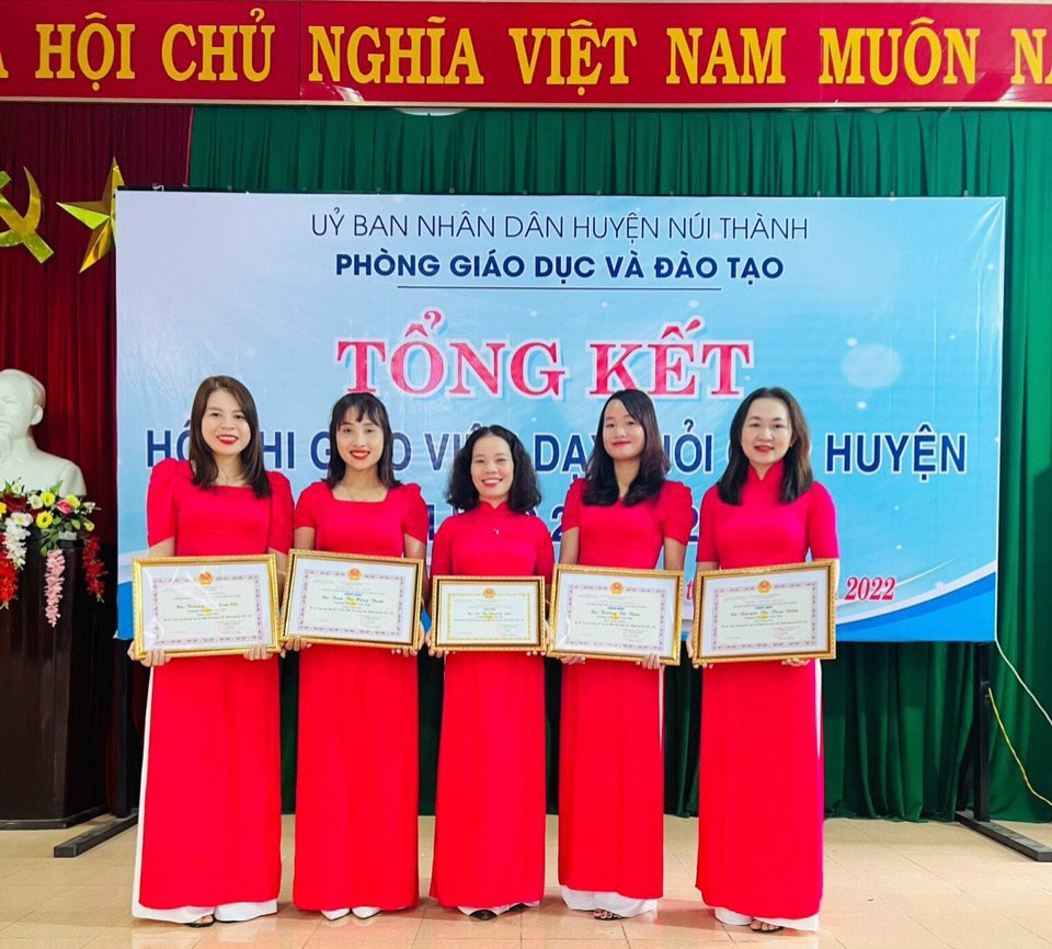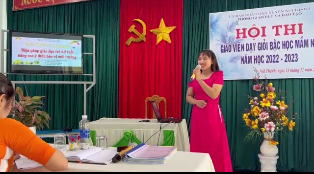Thực hiện Kế hoạch số 501/ KH-PGDĐT, ngày 05/10/2022 của Phòng GDĐT Núi Thành về việc tổ chức Hội thi Giáo viên dạy giỏi cấp học mầm non huyện Núi Thànhnăm học 2022 – 2023 vàKế hoạch số 63b/KH-MGTĐ ngày 06 tháng 10 năm 2022 của Trường MG Trúc Đào, từ 18/10/2022 đến 26/10/2022, trường MG Trúc Đào tổ chức Hội thi Giáo viên dạy giỏi cấp trường năm học 2022- 2023 và tham dự Hội thi giáo viên dạy giỏi cấp huyện. Hội thi không chỉ tôn vinh giáo viên đạt danh hiệu “Giáo viên mầm non dạy giỏi” mà còn tạo điều kiện để giáo viên thể hiện năng lực, học tập, trao đổi kinh nghiệm về chăm sóc, giáo dục trẻ; khai thác sử dụng sáng tạo, hiệu quả phương tiện, đồ dùng, đồ chơi thực hiện chương trình giáo dục mầm non, góp phần đẩy mạnh phong trào thi đua trong các cơ sở giáo dục mầm non, khuyến khích động viên, tạo cơ hội để giáo viên tự học và sáng tạo; nhân rộng điển hình tiên tiến trong hoạt động chăm sóc, giáo dục trẻ; góp phần nâng cao chất lượng giáo dục mầm non. Đồng thời Hội thi cũng là một trong những căn cứ đánh giá thực trạng đội ngũ, từ đó xây dựng kế hoạch đào tạo, bồi dưỡng nhằm nâng cao trình độ chuyên môn, nghiệp vụ cho giáo viên, đáp ứng yêu cầu đổi mới của giáo viên. Kết quả Hội thi còn dùng làm minh chứng tham gia đánh giá chuẩn nghề nghiệp theo quy định hiện hành. Với sự chỉ đạo sát sao của Ban giám hiệu, Hội thi đã được tập thể giáo viên nhà trường hưởng ứng nhiệt tình. Tham gia Hội thi, giáo viên thực hiện đủ hai nội dung: Thuyết trình một biện pháp nâng cao chất lượng chăm sóc, nuôi dưỡng, giáo dục trẻ của cá nhân giáo viên tại trường và thực hành một hoạt động cụ thể theo kế hoạch giáo dục tại thời diểm diễn ra Hội thi. Nhìn chung, Đa số các giáo viên đã nêu được thực trạng của vấn đề và lý do lựa chọn nội dung giải pháp, nhiều giải pháp mới so với trước đây, giải pháp có cải tiến, sáng tạo, đáp ứng được yêu cầu đổi mới dạy học; các giải pháp đều thực hiện được và phù hợp với đối tượng trẻ, với thực tiễn nhà trường. Đa số các giải pháp đều đem lại hiệu quả thiết thực tại đơn vị giáo viên công tác và có tính thuyết phục của minh chứng về sự tiến bộ của trẻ khi áp dụng. Các tiết dạy được chuẩn bị công phu, kĩ lưỡng và thực hiện các tiết dạy chuẩn về nội dung, kiến thức, sáng tạo về hình thức, phương pháp theo quan điểm giáo dục “Lấy trẻ làm trung tâm”. Kết quả 21/21 giáo viên đạt giáo viên dạy giỏi trường (trong đó có 02 giáo viên đạt giải nhất; 02 giáo viên đạt giải nhì; 02 giáo viên đạt giải ba; 03 giáo viên đạt giải khuyến khích) và 5/5 giáo viên đạt giáo viên dạy cấp Huyện ( trong đó có 01 giáo viên đạt giải nhất; 01 giáo viên đạt giải nhì và 02 giáo viên đạt giải ba). Sau đây là một số hình ảnh của hội thi: Các cô tham gia hội thi giáo viên giỏi cấp huyện vòng 1 Các cô trong Ban giám khảo của Hội thi giáo viên giỏi cấp huyện vòng 1 Cô Hồng Thêm trình bày “ Biện pháp giáo dục trẻ 4-5 tuổi nâng cao ý thức bảo vệ môi trường 05 giáo viên đạt Giáo viên dạy giỏi cấp huyện 2022-2023